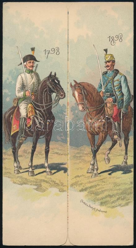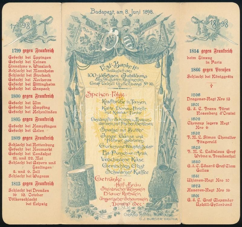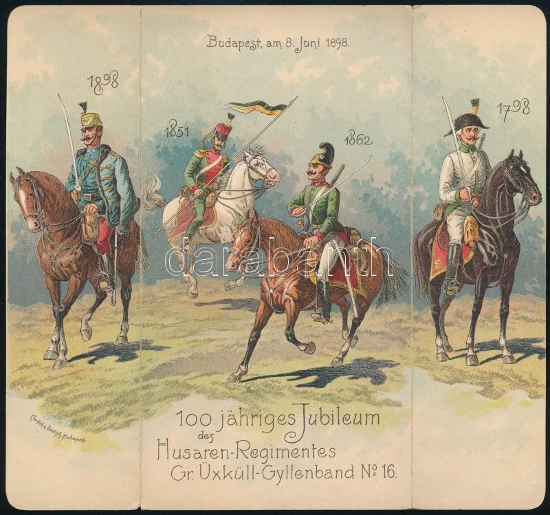 1898 Budapest, Az osztrák-magyar hadsereg 16. Gróf Üxküll Gyllenband huszárezredének 100 éves jubileumára rendezett bankett díszes menükártyája, kihatható, Czettel&Deutsch litográfia, német nyelven, 19x20 cm / Budapest, Austro-Hungarian Army, hussar regiment banquet menu card, lithography, in German, 19x20 cm