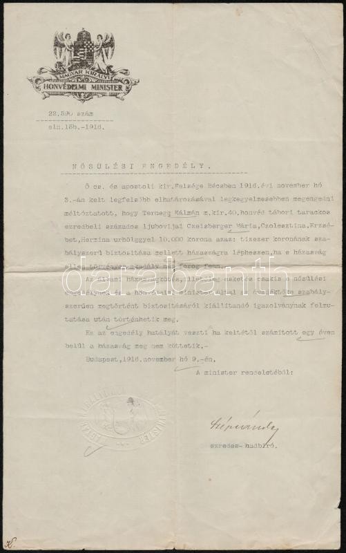1916 Díszes nősülési engedély honvédelmi minisztertől https://www.darabanth.com/de/314-Fernauktion/314.0/Andere-Sammelgebiete/Militaria~100027/1916-Diszes-nosulesi-engedely-honvedelmi-minisztertol~II1719480
