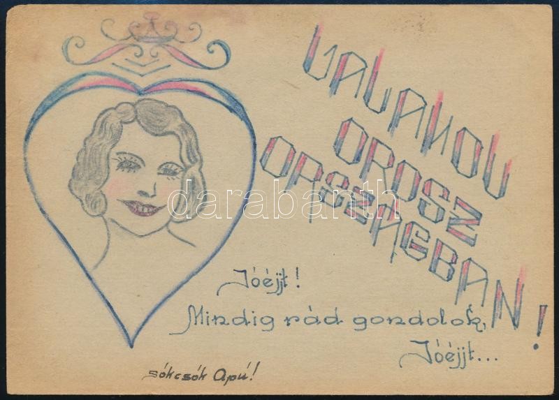 1943 Egyedi rajzos tábori posta levelezőlap az orosz frontról https://www.darabanth.com/de/314-Fernauktion/314.0/Andere-Sammelgebiete/Militaria~100027/1943-Egyedi-rajzos-tabori-posta-levelezolap-az-orosz-frontrol~II1723252