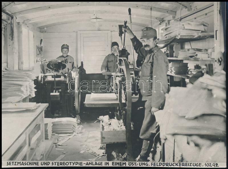 cca 1915 Osztrák-magyar tábori nyomda, nyomdagépekkel, katonákkal, feliratozott fotó, 11,5x15,5 cm / Austro-Hungarian Army field press, photo, 11,5x15,5 cm