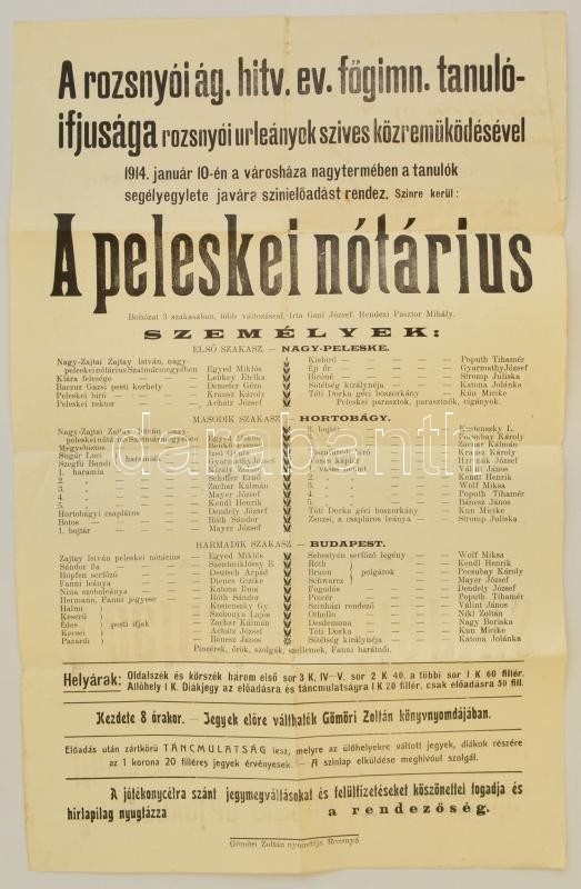 1914 Rozsnyó. Peleskei notárius színházi plakát 31x45 cm https://www.darabanth.com/de/314-Fernauktion/314.0/Andere-Sammelgebiete/Poster~100030/1914-Rozsnyo-Peleskei-notarius-szinhazi-plakat-31x45-cm~II1719639