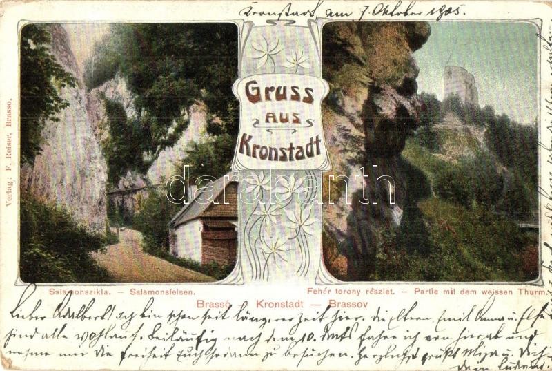 Brassó, Kronstadt, Brasov; Salamon szikla, Fehér torony / rock, tower.... https://www.darabanth.com/de/314-Fernauktion/314.0/Ansichtskarten/Siebenburgen~400006/Brasso-Kronstadt-Brasov-Salamon-szikla-Feher-torony-rock-tower-Art-Nouveau-EK~II1723714