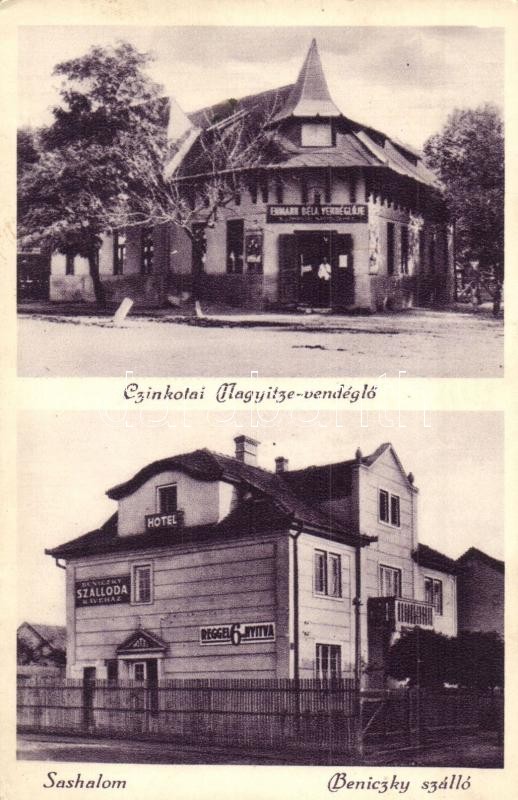 Beschreibung: Budapest XVI. Sashalom, Czinkotai Nagyitze (Cinkotai-Nagyicce) vendéglő, Beniczky szálloda és kávéház (Rb)