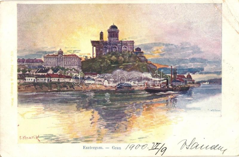 Esztergom, Bazilika, gőzhajó. s: Kohallik (EK) https://www.darabanth.com/de/314-Fernauktion/314.0/Ansichtskarten/Ungarn~400005/Esztergom-Bazilika-gozhajo-s-Kohallik-EK~II1720257