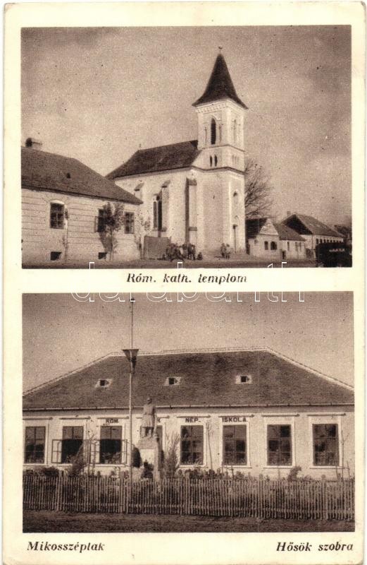 Beschreibung: Mikosszéplak, Hősök szobra, országzászló, Római katolikus templom és népiskola (Rb)