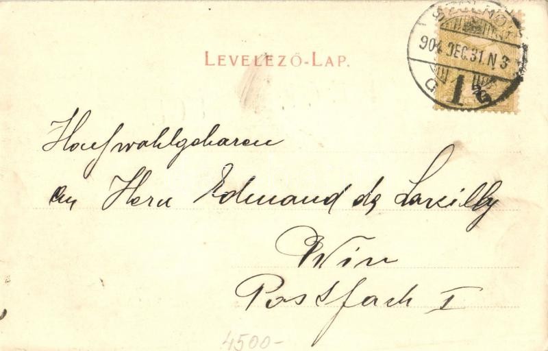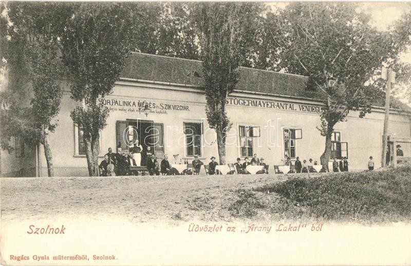 Beschreibung: Szolnok, Üdvözlet az Arany Lakatból! Bor, sör, pálinka mérés és szikvízgyár, Stögermayer Antal vendéglője, étterem. Ragács Gyula műterméből (EK)
