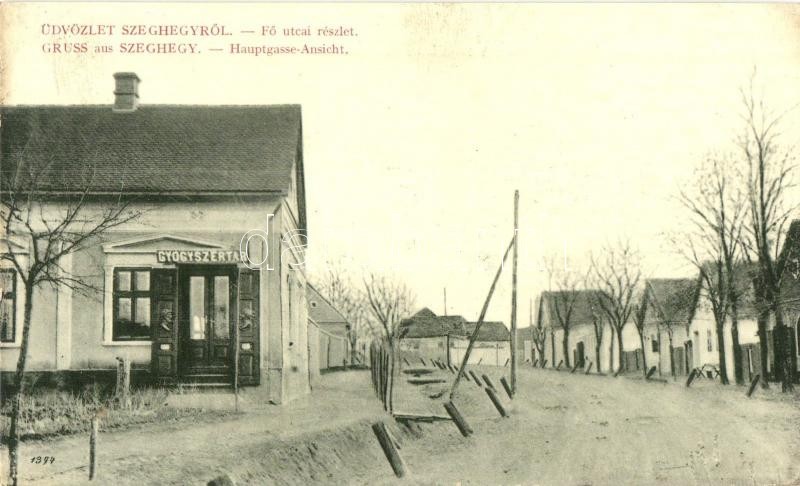 Beschreibung: Szeghegy, Sekic, Lovcenac; Fő utca, Gyógyszertár. W. L. Bp. 626. Kiadja Becker Dávid & Co. / main street, pharmacy (EK)