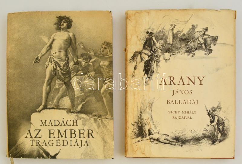 2 db Zichy Mihály munkáival illusztrált kötet: Madács Imre: Az ember tragédiája. Bp., 1960, Magyar Helikon.; Arany János balladái. Bp., 1959, Magyar Helikon. Vászon- ill. félvászon kötésben, sérült, vízfoltos papír védőborítóval, egyébként jó állapotban.