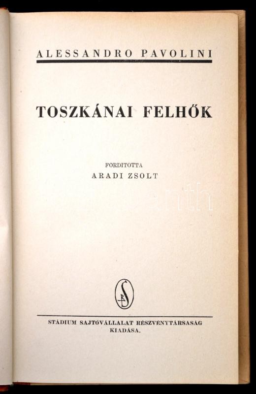 Alessandro Pavolini: Toscanai felhő. (A címlapon: Toszkánai felhők.) Fordította: Aradi Zsolt. Bp.,é.n, Stádium. Kiadói félvászon-kötés, kissé foltos gerinccel, de alapvetően jó állapotban.