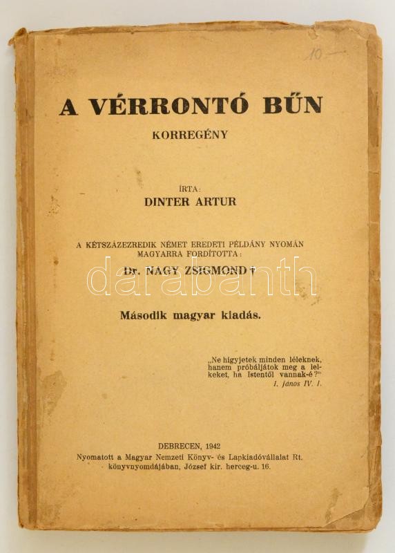 Dinter Artúr: A vérrontó bűn. Korregény. Második magyar kiadás. Debrec... https://www.darabanth.com/de/314-Fernauktion/314.0/Bucher/Bucher-Andere-kuriositaten~100046/Dinter-Artur-A-verronto-bun-Korregeny-Masodik-magyar-kiadas-Debrecen-1942-237p~II1723012