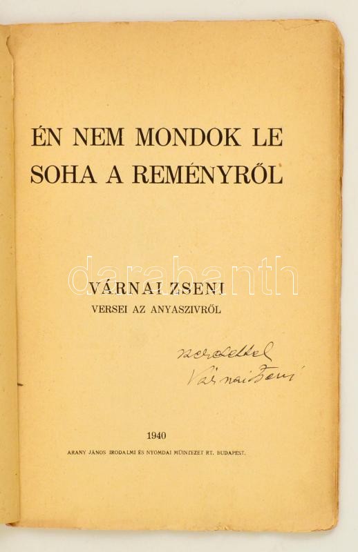Én nem mondok le soha a reményről. Várnai Zseni versei az anyaszívről. Dedikált! Bp., 1940, Arany János Irodalmi és Nyomdai Műintézet. Ragasztott papírkötésben