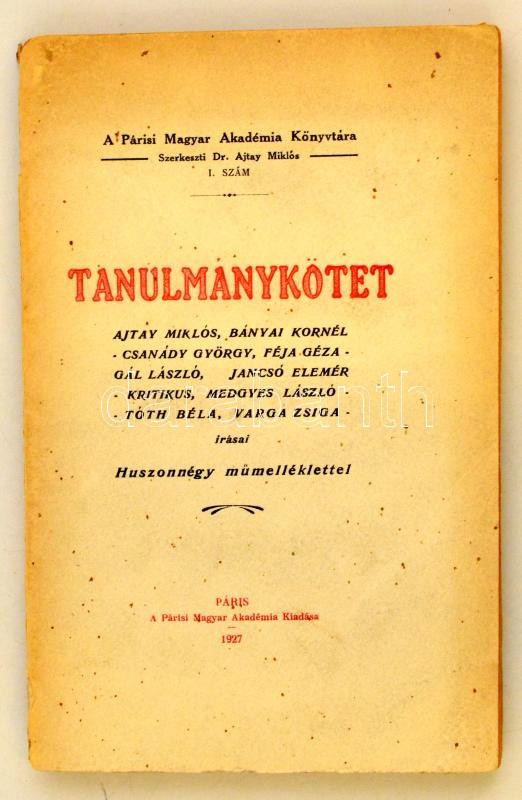 Tanuklmánykötet. Ajtay Miklós, Bányai Kornél, Csanády György, Féja Géza, Gál László, Jancsó Elemér, Kritikus, Medgyes László, Tóth Béla, Varga Zsiga írásai. Párisi Magyar Akadémia Könyvtára 1. szám. Szerk.: Dr. Ajtay Miklós. Párizs, 1927, Párisi Magyar Akadémia. Huszonnégy műmelléklettel. Kiadói papírkötés, szakadt borítóval.