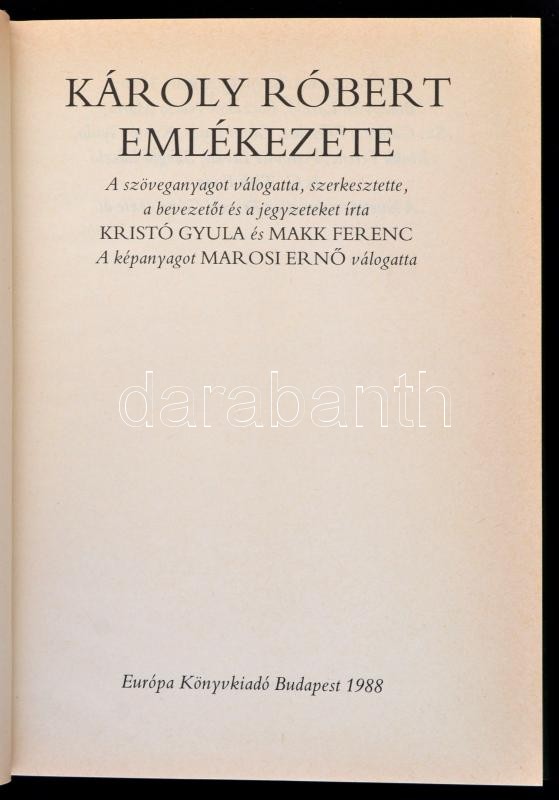 Károly Róbert emlékezete. A szöveganyagot válogatta, szerkesztette, a bevezetőt és a jegyzeteket írta Kristó Gyula, és Makk Ferenc. A képanyagot Marosi Ernő válogatta. Bp.,1988, Európa. Kiadói egészvászon-kötés, kiadói papír védőborítóban.