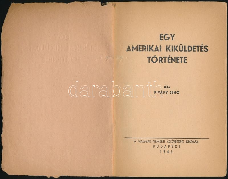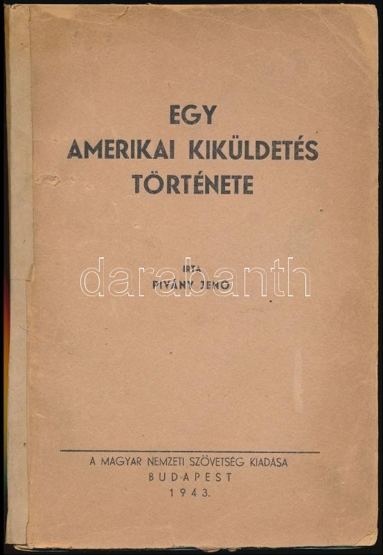 Piványi Jenő: Egy amerikai kiküldetés története. Bp.,1943, Magyar Nemzeti Szövetség, (Bányai-Várkonyi-ny.), 96 p. Kiadói papírkötés, kissé hiányos borítóval, javított gerinccel.