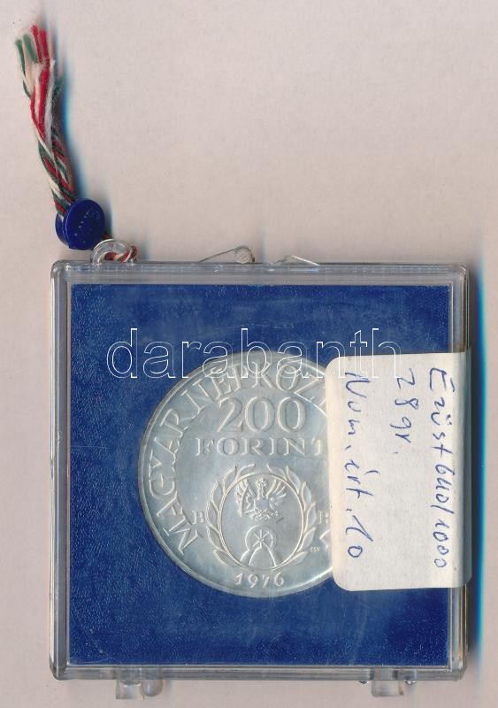 Beschreibung: 1976. 200Ft Ag "II. Rákóczi Ferenc" eredeti, sérült, plombált, MNB plasztiktokban T:BU ragasztás a tokon