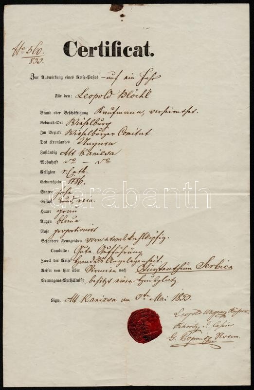 1853 Magyarkanizsa (Alt-Kanizsa), Német nyelven kiállított útlevél Sze... https://www.darabanth.com/de/315-Fernauktion/315.0/Andere-Sammelgebiete/Dokument~500019/1853-Magyarkanizsa-Alt-Kanizsa-Nemet-nyelven-kiallitott-utlevel-Szerbiaba-viaszpecsettel~II1729362