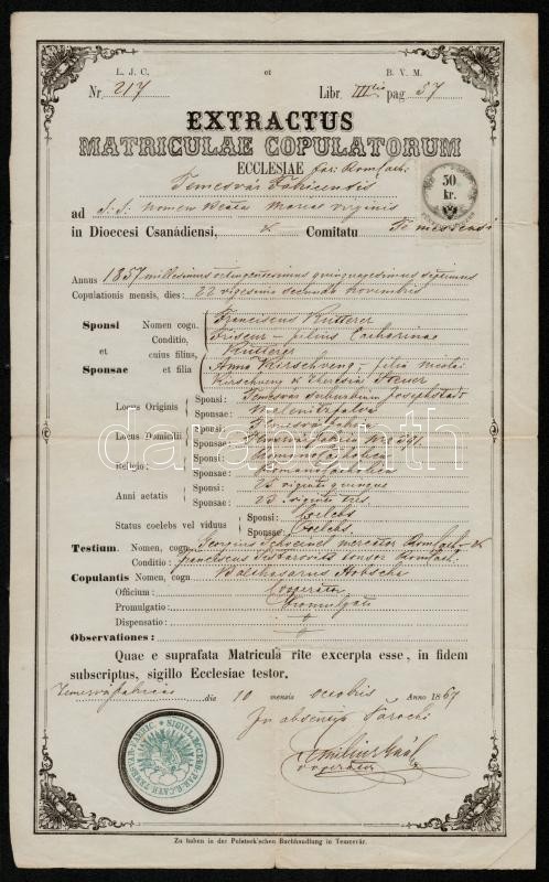 1867 Temesvár-Gyárváros / Temeswar-Farbikstadt / Timişoara-Fabric, római katolikus házassági anyakönyvi kivonat, latin nyelven, bélyegzővel, okmánybélyeggel