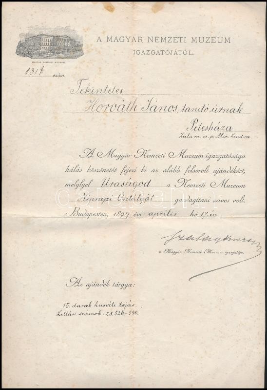 Beschreibung: 1899 Szalay Imrének (1846-1917) a Magyar Nemzeti Múzeum Igazgatójának (1894-1916) köszönő levele, a Nemzeti Múzeum fejléces papírján, Szalay Imre aláírásával.