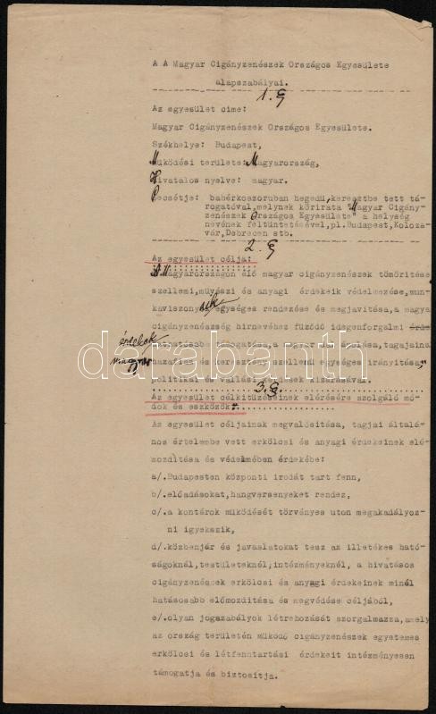 1939-1944 Magyar Cigányzenészek Országos Egyesülete alapszabályzata, p... https://www.darabanth.com/de/315-Fernauktion/315.0/Andere-Sammelgebiete/Dokument~500019/1939-1944-Magyar-Ciganyzeneszek-Orszagos-Egyesulete-alapszabalyzata-periratok-ugyvedi-megha~II1727894