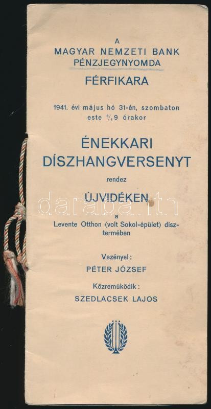 1941 A Magyar Nemzeti Bank Pénzjegynyomda Férfikara énekkari díszhangv... https://www.darabanth.com/de/315-Fernauktion/315.0/Andere-Sammelgebiete/Drucksachen~500034/1941-A-Magyar-Nemzeti-Bank-Penzjegynyomda-Ferfikara-enekkari-diszhangversenye-Ujvideken-musor~II1727659