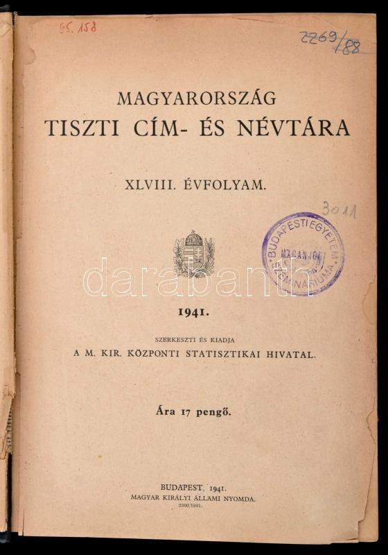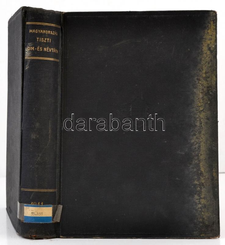 1941 Magyarország tiszti cím- és névtára. XLVIII. évf. Szerk.: Magyar Királyi Központi Statisztikai Hivatal. Bp., Magyar Királyi Állami Nyomda. Kiadói egészvászon-kötés, kopott, foltos borítóval, a végén két kijáró lappal, intézményi bélyegzővel.