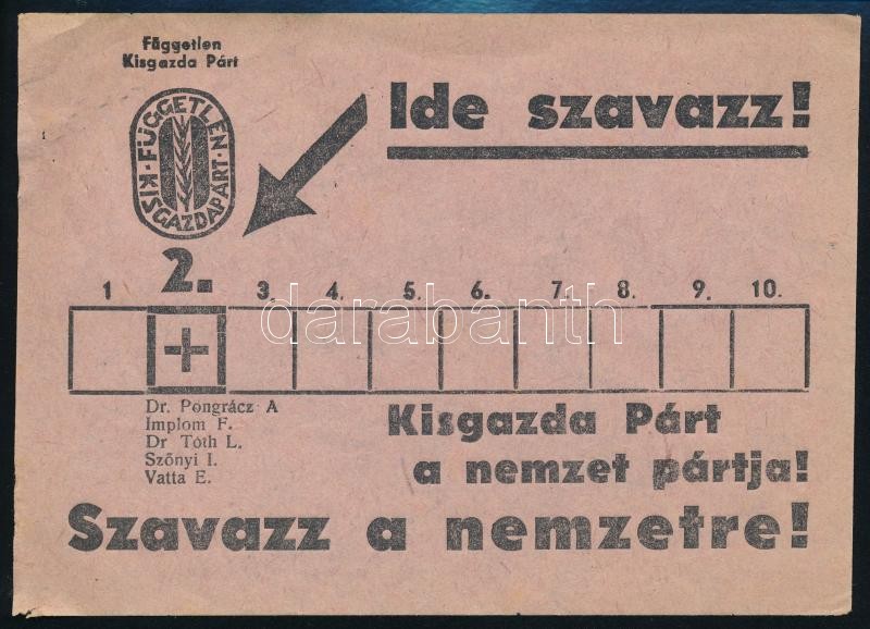 1947 A "Független Kisgazda Párt a nemzet pártja!" - választási szóróla... https://www.darabanth.com/de/315-Fernauktion/315.0/Andere-Sammelgebiete/Drucksachen~500034/1947-A-Fuggetlen-Kisgazda-Part-a-nemzet-partja--valasztasi-szorolap~II1729659