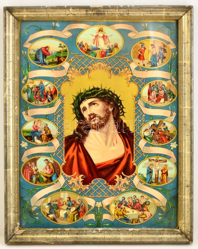 Beschreibung: cca 1920-1930 Jézus Krisztus, litho szentkép, sérült fa keretben, 41,5×30,5 cm