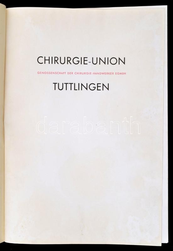 cca 1941 Chirurgie-Union Genossenschaft der Chirurgier-Handwerker EGMBH, Tuttlingen, orvosi termékkatalógusa. Stuttgart, J. Fink-ny., 102 p. Kartonált papírkötésben, kopott borítóval, sérült gerinccel, német nyelven. Számozott, 243. számú példány.