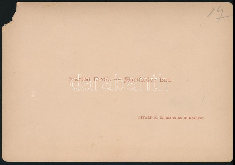 1880 Bártfai fürdő, keményhátú fotó Divald Károly műterméből, sarokhib... https://www.darabanth.com/de/315-Fernauktion/315.0/Andere-Sammelgebiete/Foto~2500018/1880-Bartfai-furdo-kemenyhatu-foto-Divald-Karoly-mutermebol-sarokhibaval-11C39716-cm~II1729576