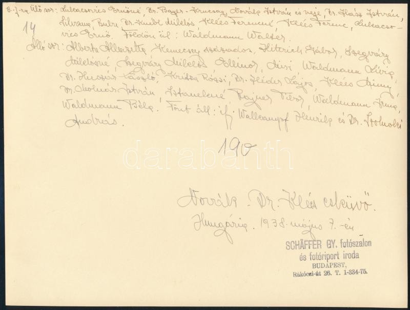 1936-1938 Vegyes fotó tétel, 15 db, közte báli (pl.: MAC garden-party (1936. jún., nov., dec., (6 db), Athléta bál (2 db)...stb) és esküvői fotók,(5 db, Novák-Dr. Klées, ugyan azon az esküvőn készültek), két fotó hátoldalán a rajta szereplő esküvői társaság neveivel feliratozva, Schäffer fotószalon és fotóriport Bp. fotói, a hátoldalakon pecséttel jelzettek, egy kivételével a hátoldalakon feliratozva, 17x23 cm és 13x8 cm