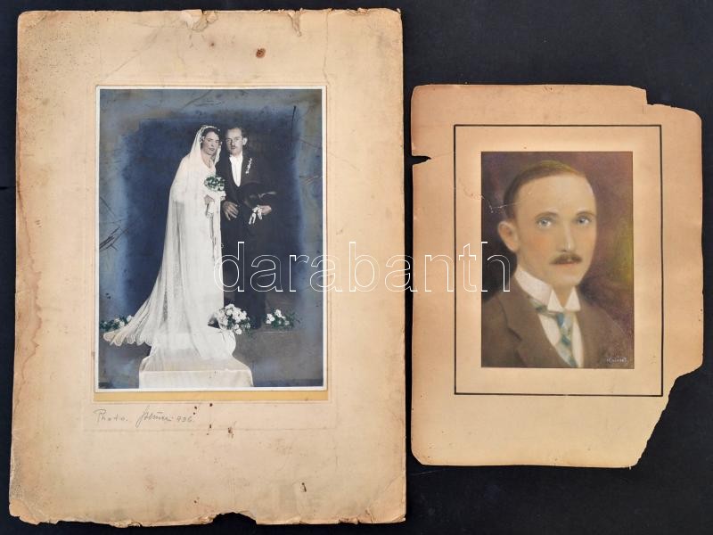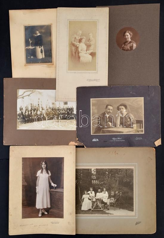Vegyes fotó tétel, 11 db, (Bíró Csíkszereda, Kozma Fényképész Újpest, H. Axtmann Plauen, Kossak József, Photo Stemmer Bp., Vajda M. Pál Bp., ..stb.),kettő kivételével kartonon, egy színezett (sérült, hiányos, sérült kartonnal), nagyrészt sérült, foltos, megviselt állapotban,18x24 cm és 15x10 cm.
