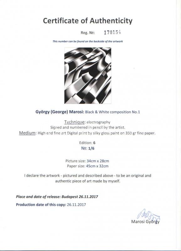 Beschreibung: Marosi György (1964-): Black & White composition No.1. Elektrográfia, papír, jelzett, számozott (1/6) 34x28 cm