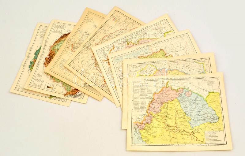 Beschreibung: cca 1890 8 db történelmi Magyaroszágot ábrázoló különféle térkép. Pl a filoxéra terjedése és más Pallas térképek 30x25 cm