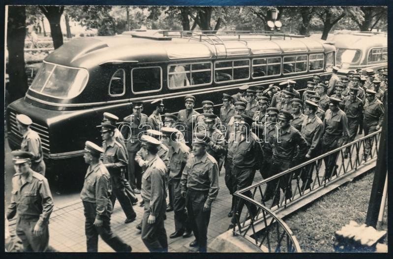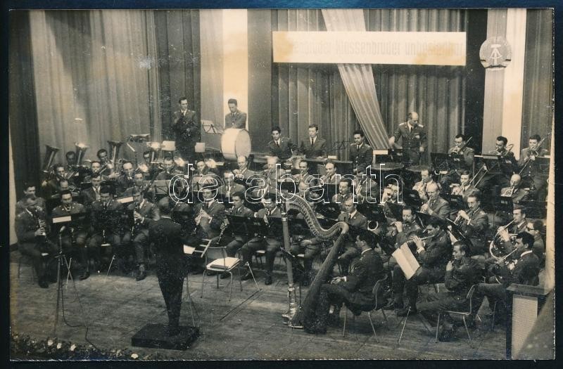 Beschreibung: 1968 a Magyar Katonazenekar tagjainak vendégfellépése az NDK-ban3 db fotó + 1 db foltos emléklap