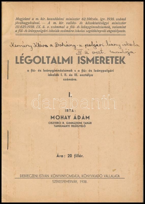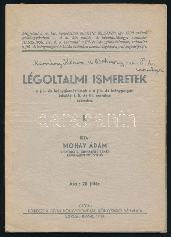 Mohay Ádám: Légoltalmi ismeretek a fiú- és leánygimnáziumok a s fiú- és leánypolgári iskolák I. II. és III. osztálya számára. Székesfehérvár, 1938, Debreczeni István Könyvnyomdája. Kiadói papírkötés, kissé kopottas állapotban.