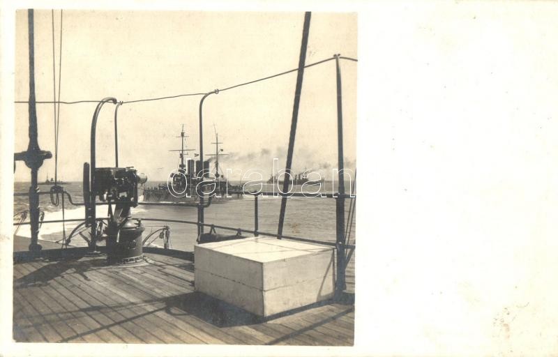 Osztrák-magyar Erzherzog Karl osztályú csatahajó a háttérben / K.u.K. Kriegsmarine, Erzherzog Karls-class warship in the background. Phot. Alois Beer 1910.
