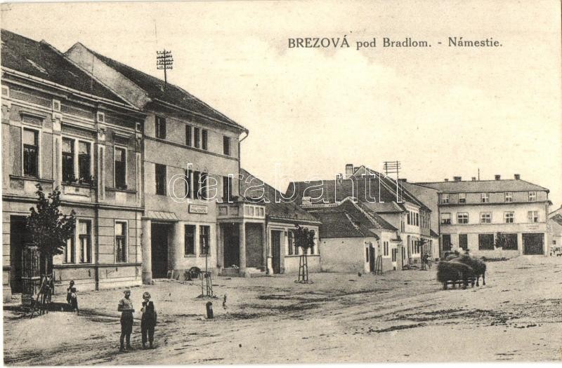 Beschreibung: Berezó, Brezová pod Bradlom; tér üzlettel. St. Halabrín kiadása / Namestie / square with shop