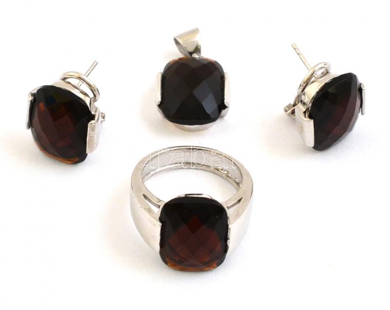 Beschreibung: Ezüst(Ag) bordó köves szett, gyűrű (méret: 56), fülbevalópár, függő, bruttó: 17,9 g