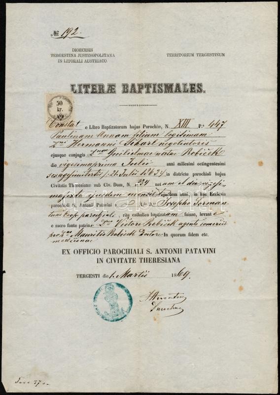Beschreibung: 1869 Trieszt, keresztelési anyakönyvi kivonat, latin nyelven, okmánybélyeggel