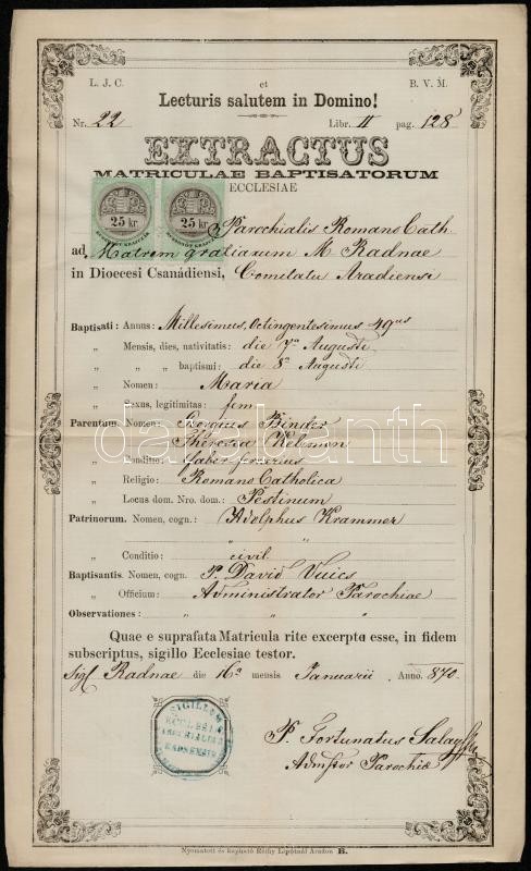 1870 Radna, latin nyelvű keresztelési anyakönyvi kivonat, okmánybélyeg... https://www.darabanth.com/de/316-Fernauktion/316.0/Andere-Sammelgebiete/Dokument~16/1870-Radna-latin-nyelvu-keresztelesi-anyakonyvi-kivonat-okmanybelyeggel~II1737244