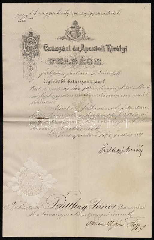 1892 Zsolnai albíróvá történő kinevezés Szilágyi Dezső (1840-1901) iga... https://www.darabanth.com/de/316-Fernauktion/316.0/Andere-Sammelgebiete/Dokument~16/1892-Zsolnai-albirova-torteno-kinevezes-Szilagyi-Dezso-1840-1901-igazsagugy-miniszter-a~II1732914