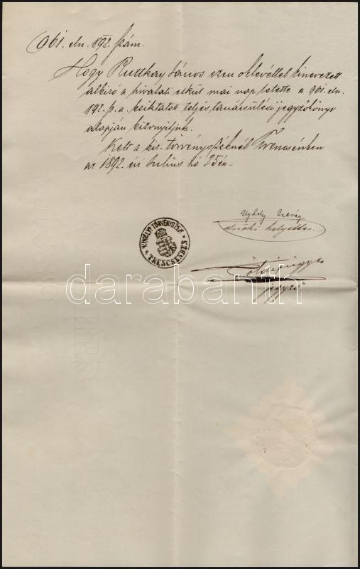 Beschreibung: 1892 Zsolnai albíróvá történő kinevezés Szilágyi Dezső (1840-1901) igazságügy-miniszter aláírásával, szárazpecséttel