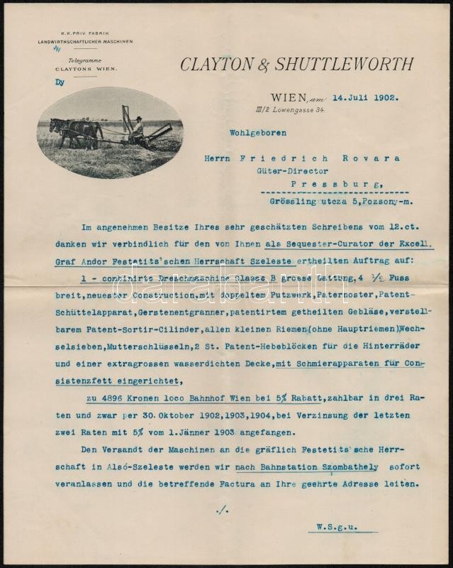 1902 Wien (Bécs), Calyton & Webb K.K. Priv. Fabrik Landwirtschaftliche... https://www.darabanth.com/de/316-Fernauktion/316.0/Andere-Sammelgebiete/Dokument~16/1902-Wien-Becs-Calyton-Webb-KK-Priv-Fabrik-Landwirtschaftlicher-Maschinen-fejleces-levelp~II1736006