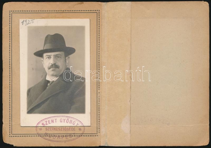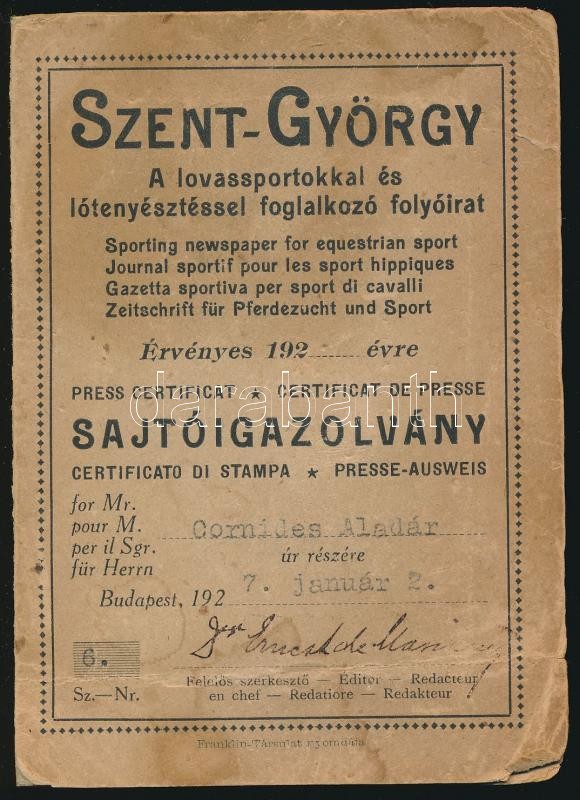 Beschreibung: 1926 Szent György a lovassportokkal és lótenyésztéssel foglalkozó folyóirat fényképes sajtóigazolvány