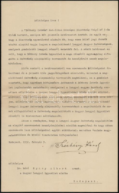 1932 Bp., A Lengyel Magyar Szövetség alapításáról szóló levél, Széchén... https://www.darabanth.com/de/316-Fernauktion/316.0/Andere-Sammelgebiete/Dokument~16/1932-Bp-A-Lengyel-Magyar-Szovetseg-alapitasarol-szolo-level-Szechenyi-Karoly-alairC3~II1736206