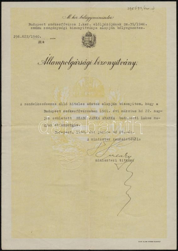 1940 Állampolgársági bizonyítvány budapesti lakos részére https://www.darabanth.com/de/316-Fernauktion/316.0/Andere-Sammelgebiete/Dokument~16/1940-Allampolgarsagi-bizonyitvany-budapesti-lakos-reszere~II1736966