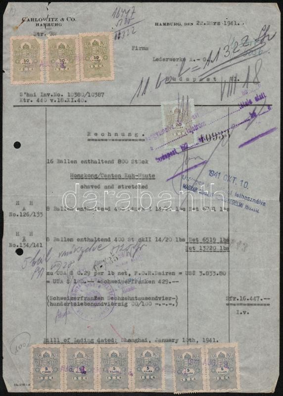 Beschreibung: 1941 Hamburg, Carlowitz & Co. fejléces levélpapírjára kiállított számla illetékbélyegekkel