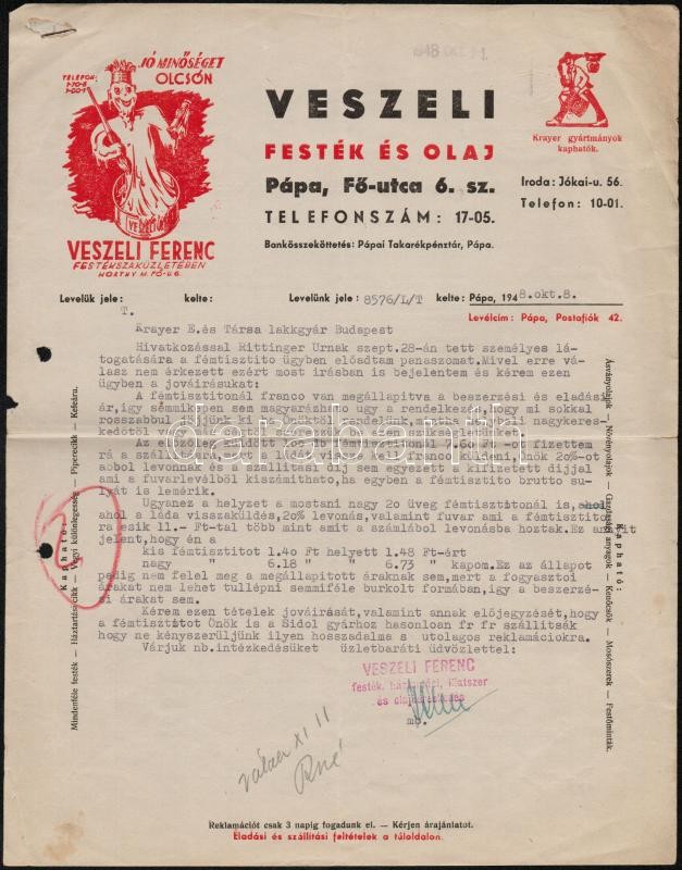 1948 Pápa, A Veszeli Festék és Olaj Szaküzletének fejléces levélpapírj... https://www.darabanth.com/de/316-Fernauktion/316.0/Andere-Sammelgebiete/Dokument~16/1948-Papa-A-Veszeli-Festek-es-Olaj-Szakuzletenek-fejleces-levelpapirjara-irt-uzleti-levC3~II1735944