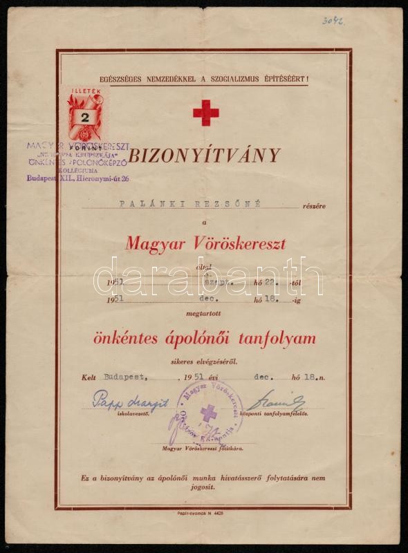 1951 a Magyar Vöröskereszt bizonyítványa önkéntes ápolónői tanfolyam e... https://www.darabanth.com/de/316-Fernauktion/316.0/Andere-Sammelgebiete/Dokument~16/1951-a-Magyar-Voroskereszt-bizonyitvanya-onkentes-apolonoi-tanfolyam-elvegzeserol-okmC3~II1737966