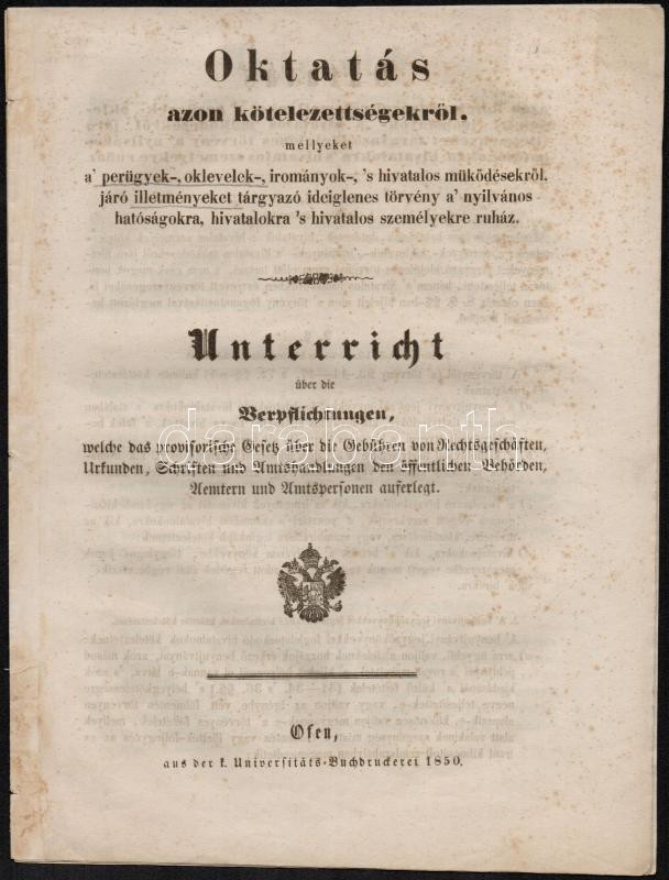 1850 Ofen, "Oktatás azon kötelezettségekről, mellyeket a perügyek-, oklevelek-, irományok-, s hivatalos működésekről, járó illetményeket tárgyazó ideiglenes törvény a nyilvános hatóságokra, hivatalokra s hivatalos személyekre ruház" 8p